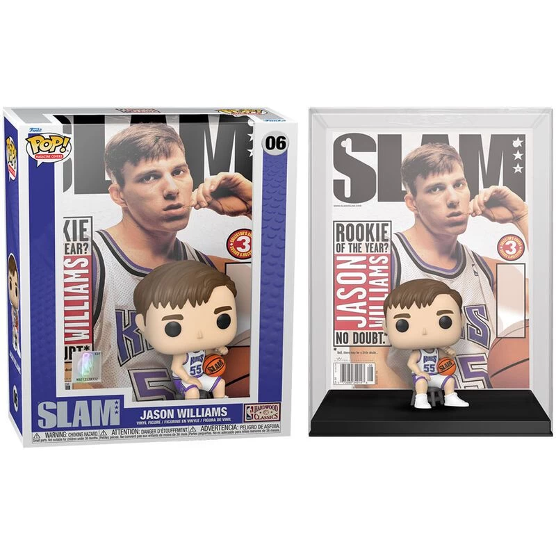 Funko POP! Figur von Jason Williams, Point Guard der Sacramento Kings. Diese Serie der Funko Pop Figuren zeichnet sich durch Ihre Grösse und den unterschiedlich thematisierten Hintergründen ab, in diesem Falls das Cover des berühmten „Slam“-Magazins.