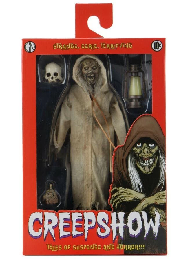 Der Creep verfügt über 25 Gelenkpunkte und kommt mit Kunsthaar und einem Stoffgewand das über eine Drahtarmatur verfügt. So sind der Fantasie bei der Positionierung keinen Grenzen gesetzt. Neben der Laterne und dem Totenkopf wird auch noch Creepshow Comic-Zubehör geliefert.