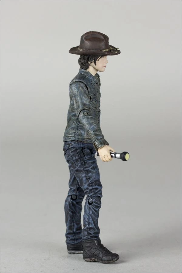 Die bewegliche Figur des Jungen Carl Grimes kommt mit Cowboyhut, großem Kerzenständer aus Terminus, geöffneter Konservendose, sowie einer Taschenlampe als Zubehör.