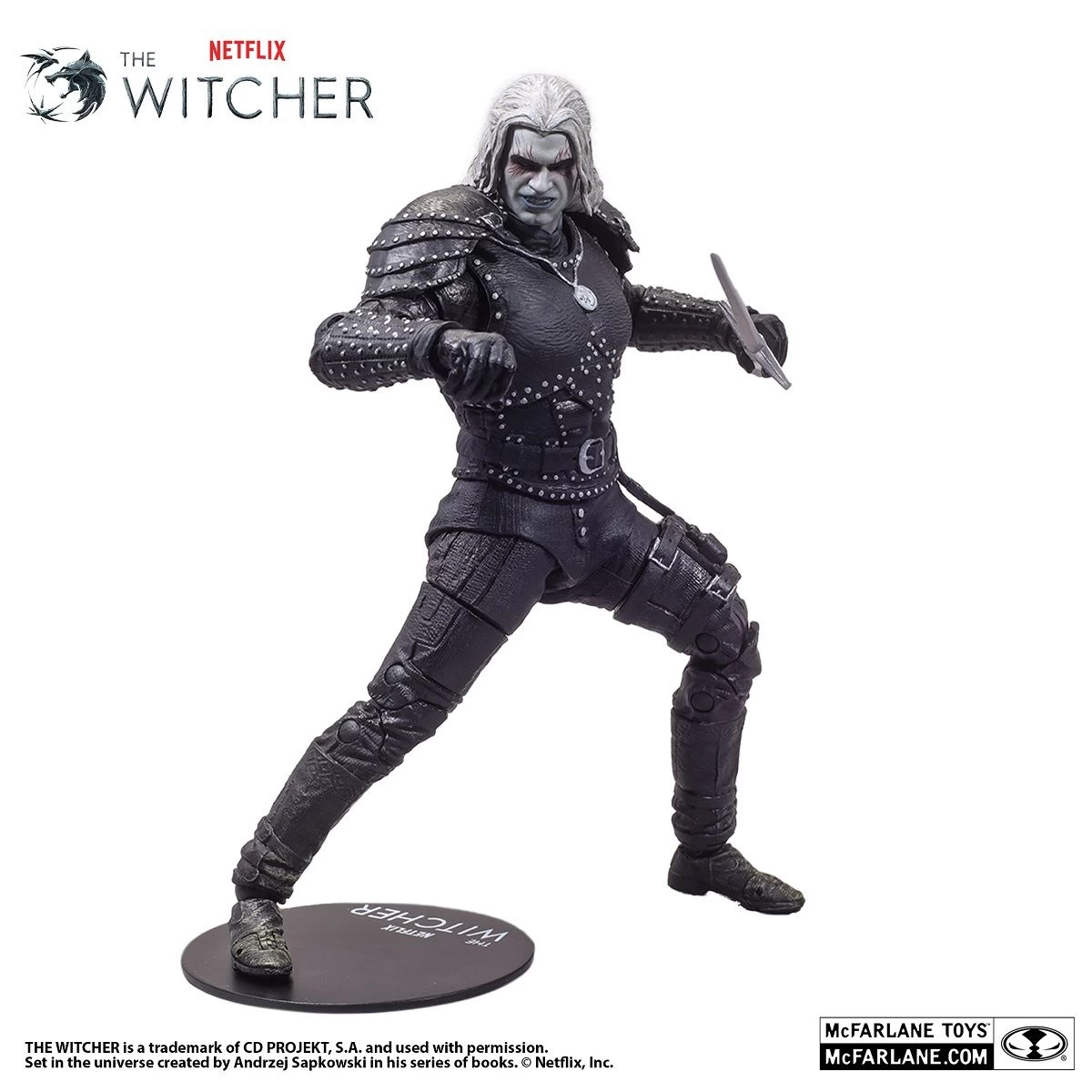 Aus der 2.Season von The Witcher, bekannt als der Weiße Wolf oder der Schlächter von Blaviken, Geralt von Riva, als 18cm große Actionfigur von McFarlane Toys, im Witcher Mode. Als Kind ließ seine Mutter Visenna Geralt in der Hexerfestung von Kaer Morhen zurück, wo er sich zum Monstertöter ausbilden ließ.